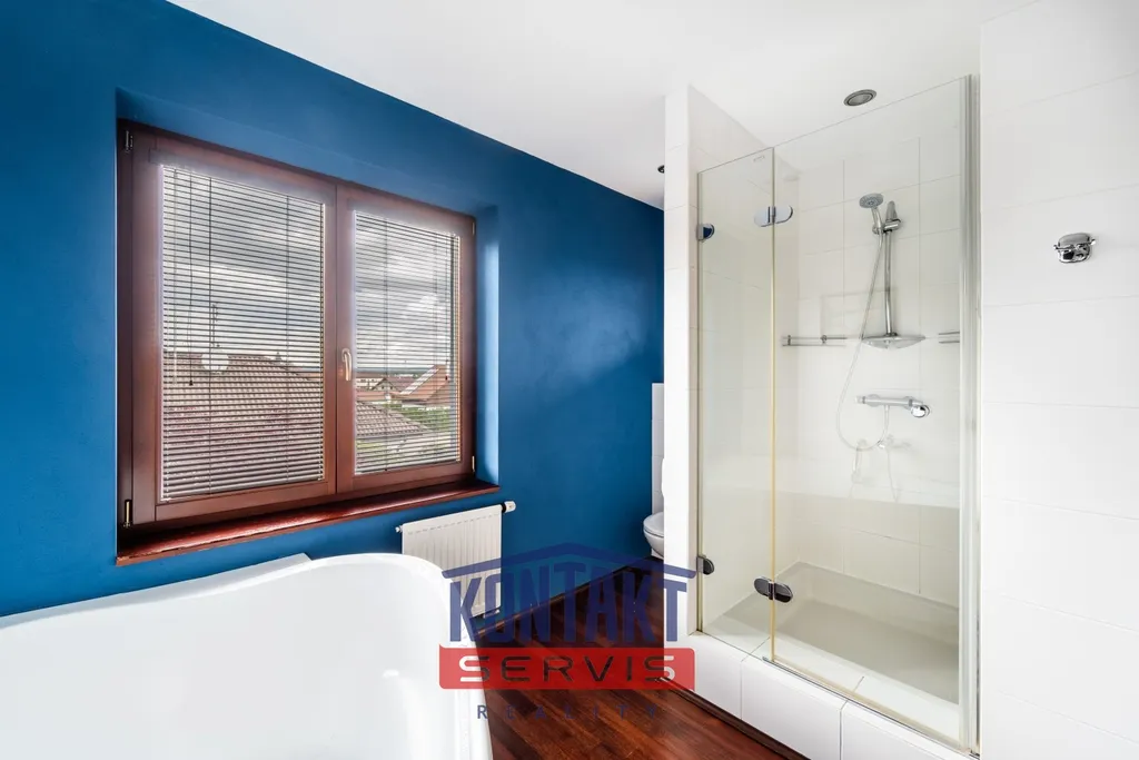 V prvním patře jsou umístěny 2 dětské pokoje, hlavní ložnice, pracovna a prostorná koupelna s vanou, sprchovým koutem a WC.