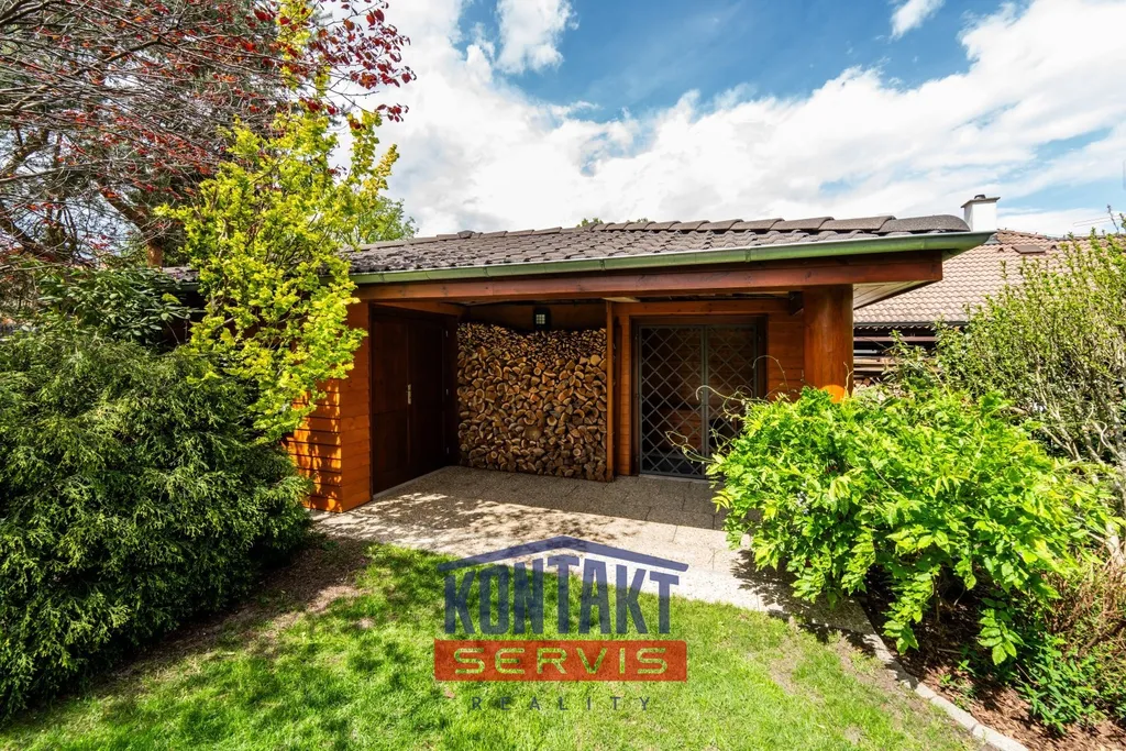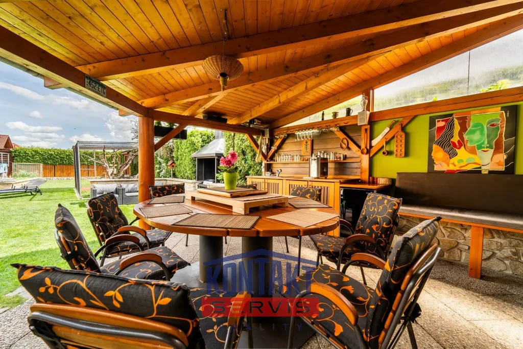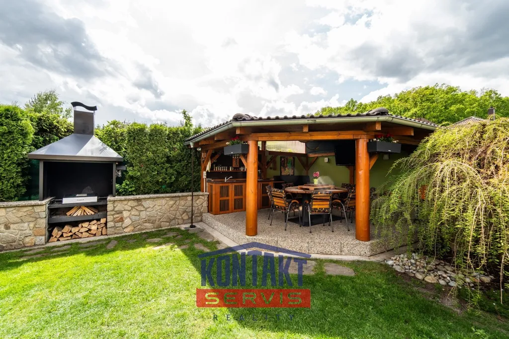 Venkovní prostory zahrnují terasu, okrasnou zahradu, venkovní bazén, zahradní domek s venkovní kuchyní a krb - ideální pro letní posezení a relaxaci.