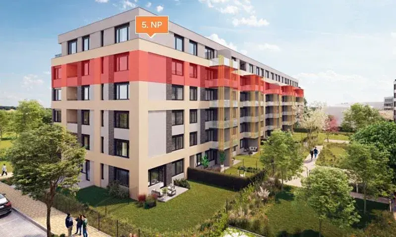 Bytová jednotka 1+kk o velikosti 33,3 m2 + balkon 6,0 m2 se nachází v 5. nadzemním podlaží (z celkových šesti) s orientací na východ.