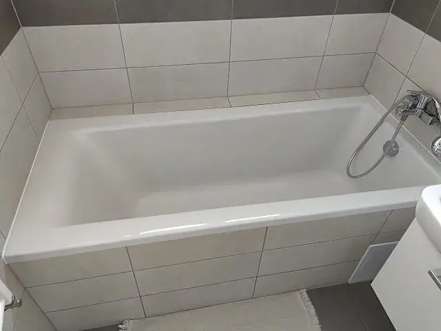 Koupelna: vana, vestavěné umyvadlo, pračka se sušičkou, skříňka, zrcadlo, WC