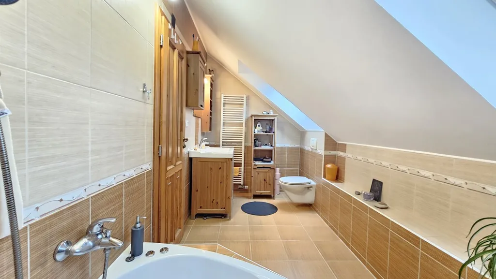 Srdcem domu je prostorný obývací pokoj s krbem a přímým vstupem na terasu, na který plynule navazuje plně vybavená kuchyně. V každém podlaží je k dispozici koupelna s toaletou. Vytápění i ohřev vody zajišťuje plynový kotel.
