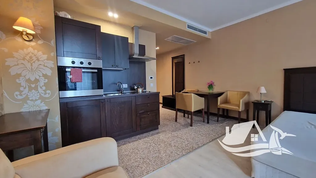 Interiér působí vzdušně, příjemně a přirozeně navazuje na okolní středomořskou atmosféru. Obývací pokoj s kuchyňským koutem je světlý a otevřený, zatímco balkon nabízí prostor pro tiché ranní chvíle i večerní posezení. Apartmán je kompletně zařízený a připravený k okamžitému užívání – stačí vstoupit a začít si užívat jeho pohodlí.