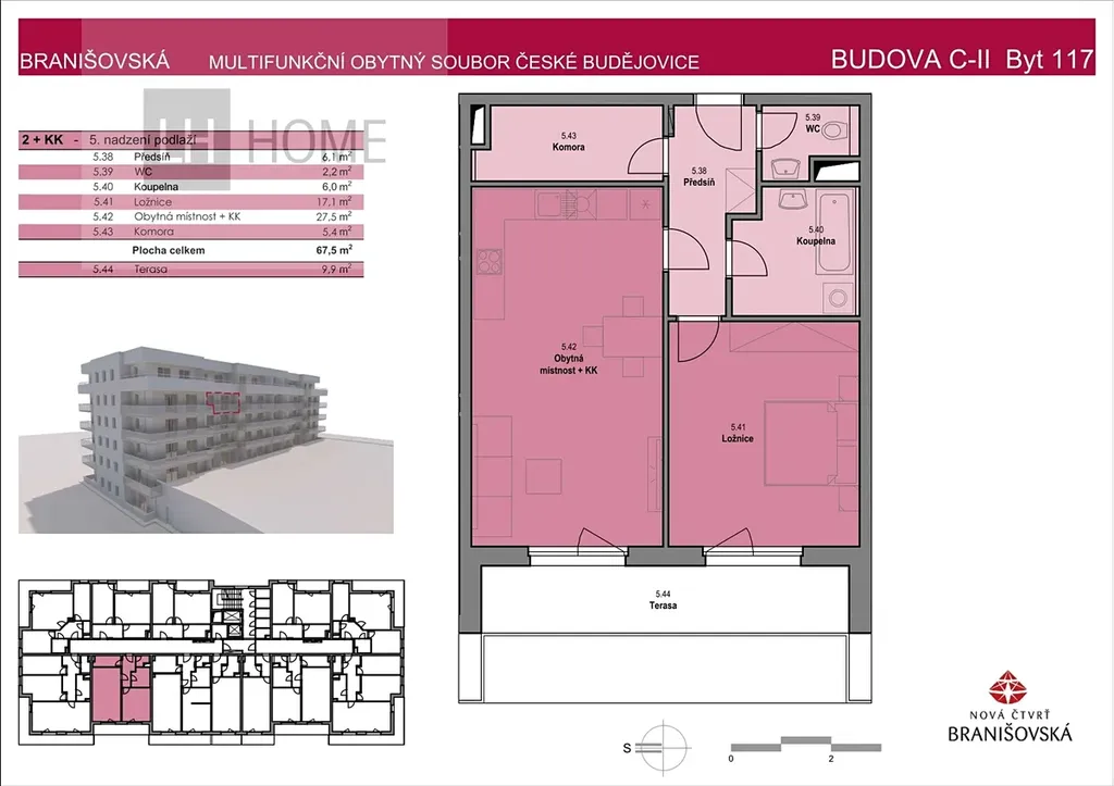 Nabízíme k prodeji moderní a nadstandardně prostorný byt 2+kk o celkové ploše 67,50 m², který je doplněn o balkon 9,90 m². Byt se nachází v 5. podlaží nového rezidenčního projektu Nová čtvrť Branišovská a poskytuje komfortní a funkční bydlení vhodné pro jednotlivce, pár nebo jako investici.