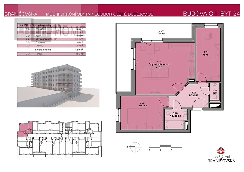 K dispozici je moderní byt 3+kk o velikosti 62 m² s terasou 15,90 m² v projektu Nová čtvrť Branišovská, České Budějovice.