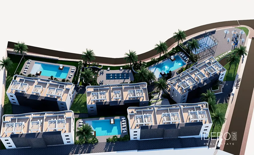 Rezidenční komplex má 3 bazény a vířivky, wellness centrum s posilovnou a kurtem na paddle tenis, velké zelené plochy, dětské hřiště a výtahy ve všech blocích.