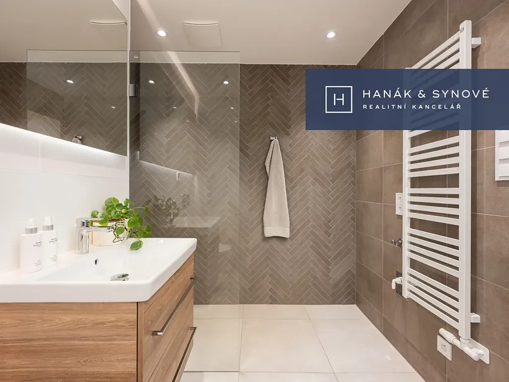 Byt je zařízený ve vysokém standardu a je nabízen kompletně zařízený – kuchyňská linka se spotřebiči (varná deska, digestoř, mikrovlnná trouba, myčka, vestavěná lednice s mrazákem), vestavěná skříň, postel, jídelní stůl se židlemi, botník, věšák, venkovní žaluzie. Koupelna je vybavena walk-in sprchovým koutem se skleněnou zástěnou značky HÜPPE, záchodem a umyvadlem s umyvadlovou skříňkou, podsvíceným zrcadlem a pračkou kombinovanou se sušičkou.