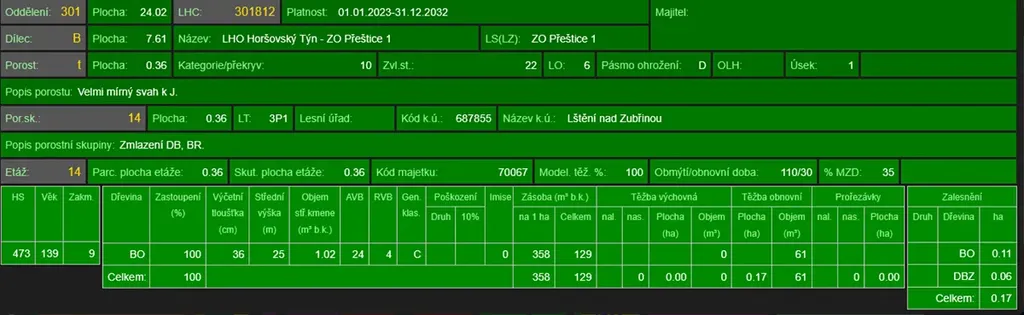 - p.č. 1254 vedená jako lesní pozemek o celkové výměře 3 635 m2, vlastníme podíl 1/2 tedy 1 818 m2 (stáří lesa 141 let - zastoupení dřevin borovice )