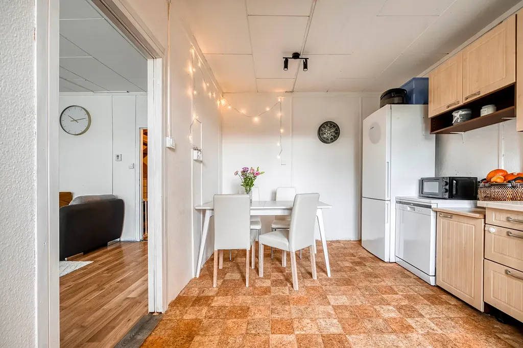 Dům je dvoupodlažní montovaná dřevostavba, která nabízí více soukromí a větší pozemek oproti prostředním domům v řadě.