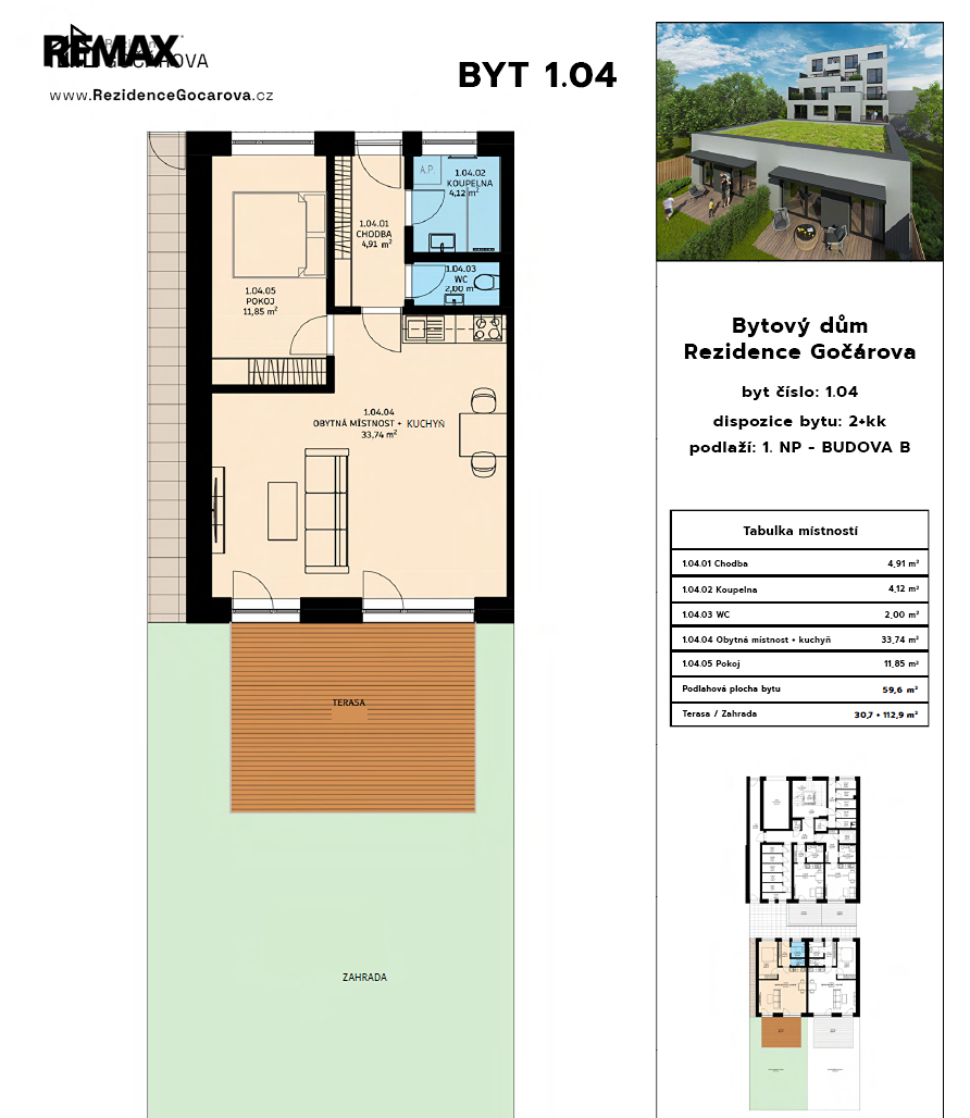 Byt číslo 104 o dispozici 2+kk (59,6 m²), s celkovou plochou k užívání 203,2 m², je umístěn v zeleném vnitrobloku bytového domu. Pyšnit se může 30,7 m² velikou terasou, která plynule navazuje na vlastní soukromou zahradu o výměře 112,9 m², na které můžete příjemně relaxovat, grilovat a užívat si zeleného vnitrobloku. Vzhledem k tomu, že se nacházíme v atraktivní části města, je jakákoliv možnost vlastnictví zahrady se zelení poměrně vzácná.