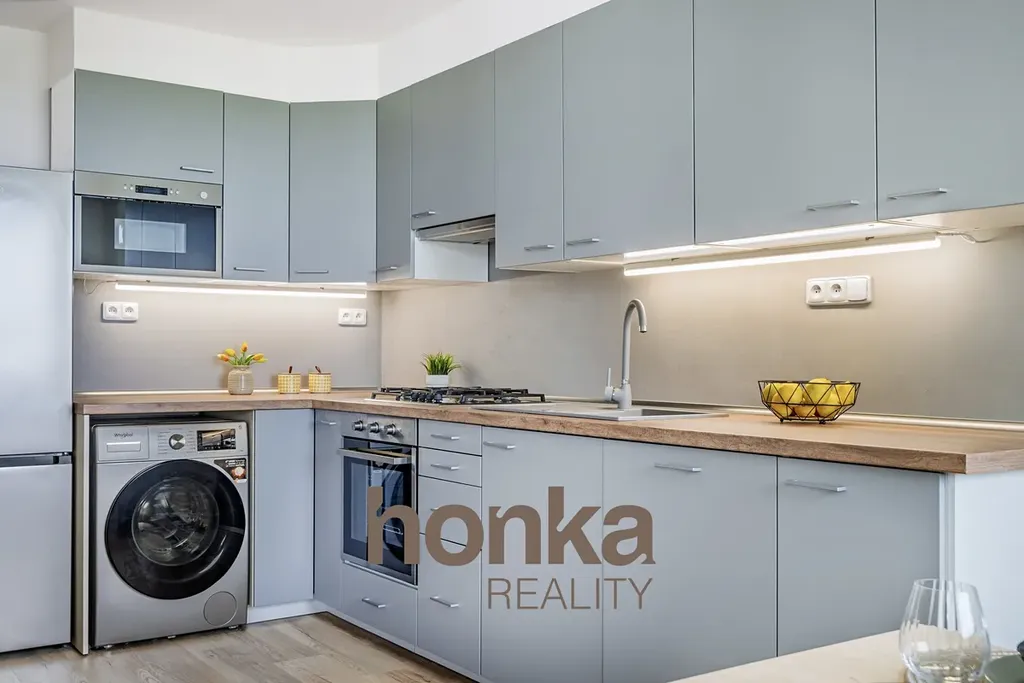 V kuchyni je instalována nová kuchyňská linka včetně spotřebičů – myčka, lednice, pračka, plynový sporák (s přípravou na elektrický).