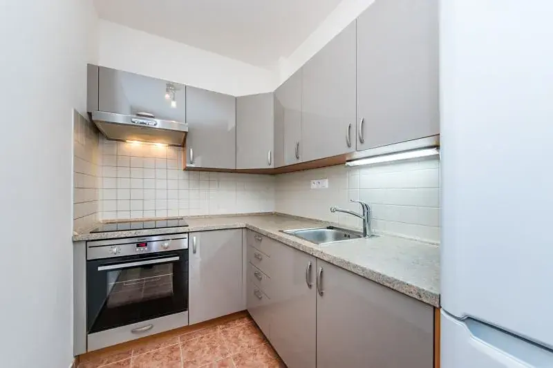 Byt je zařízený kuchyňskou linkou se sklokeramickou varnou deskou, horkovzdušnou troubou a lednicí, koupelna se sprchovým koutem a WC, v předsíni vestavěná šatní skříň.