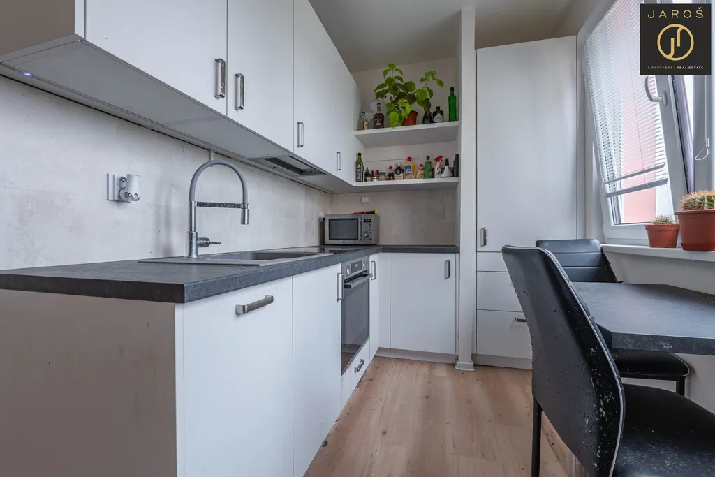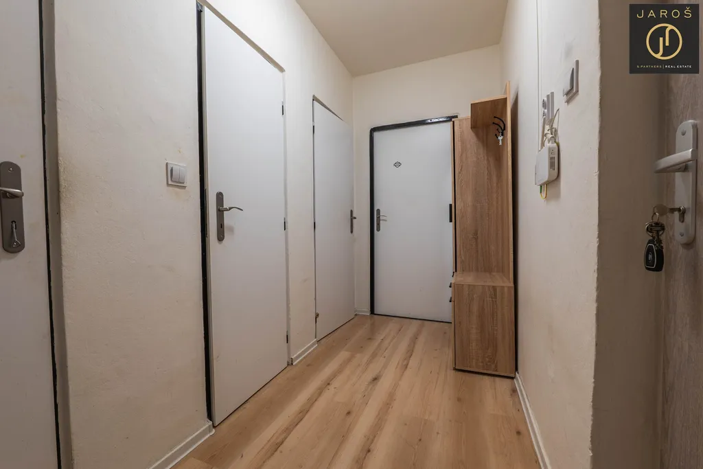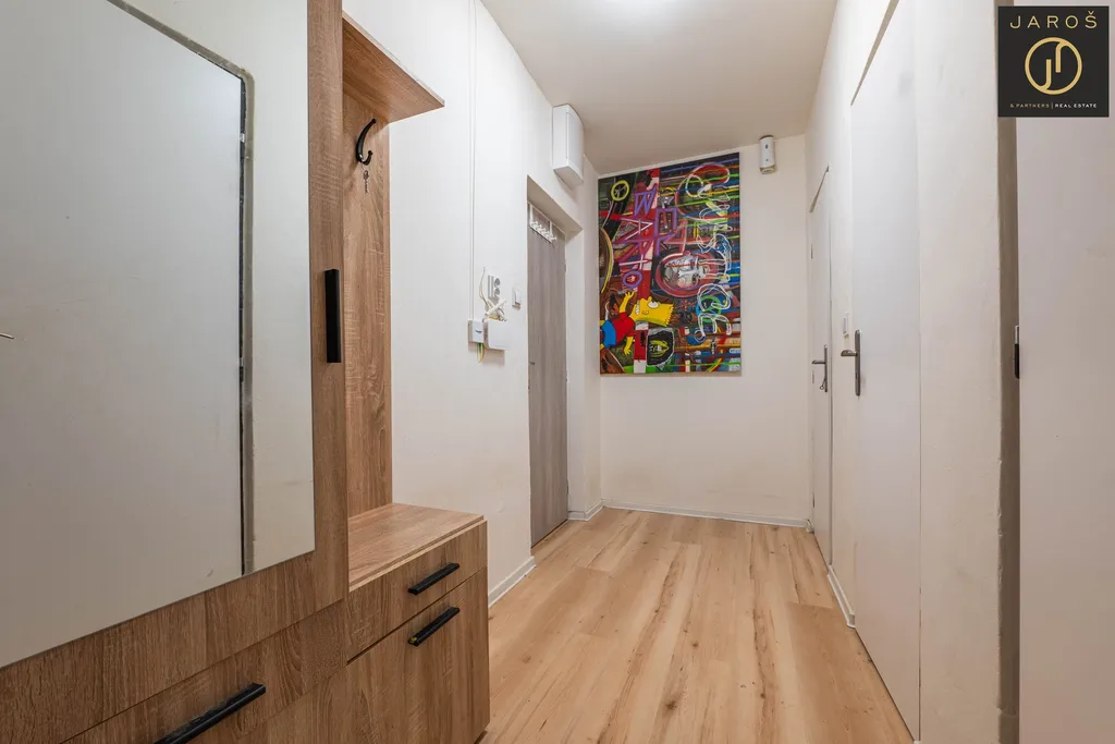 Dispozice bytu je řešena vstupní chodbou, ze které je přístup do všech místností. Obývací pokoj navazuje na kuchyňskou část s linkou na míru. Koupelna prošla rekonstrukcí stejně jako jádro, rozvody elektřiny, podlahy i omítky. Orientace bytu na jihovýchod zajišťuje dostatek denního světla.