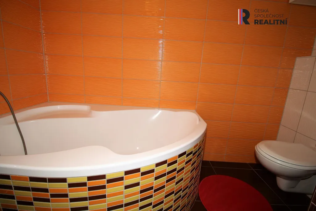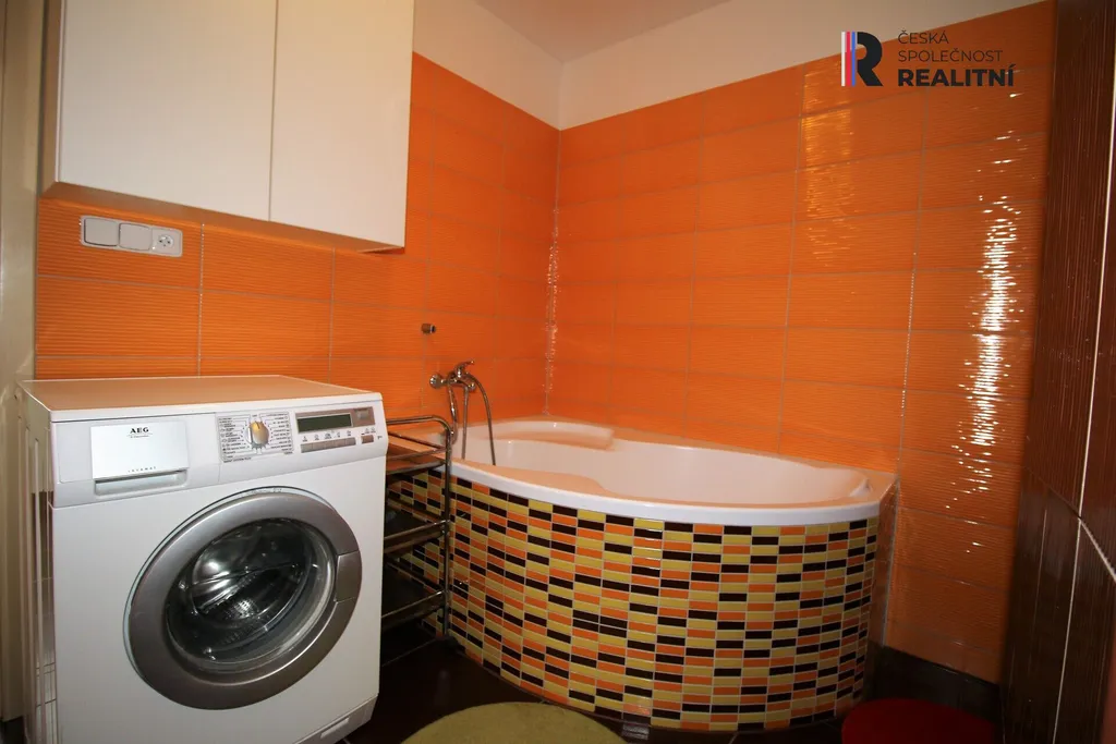 Po vstupu do bytu vás přivítá předsíň s prostornou vestavěnou skříní. Po levé straně se nachází koupelna s rohovou vanou, pračkou značky AEG a úložnými prostory.