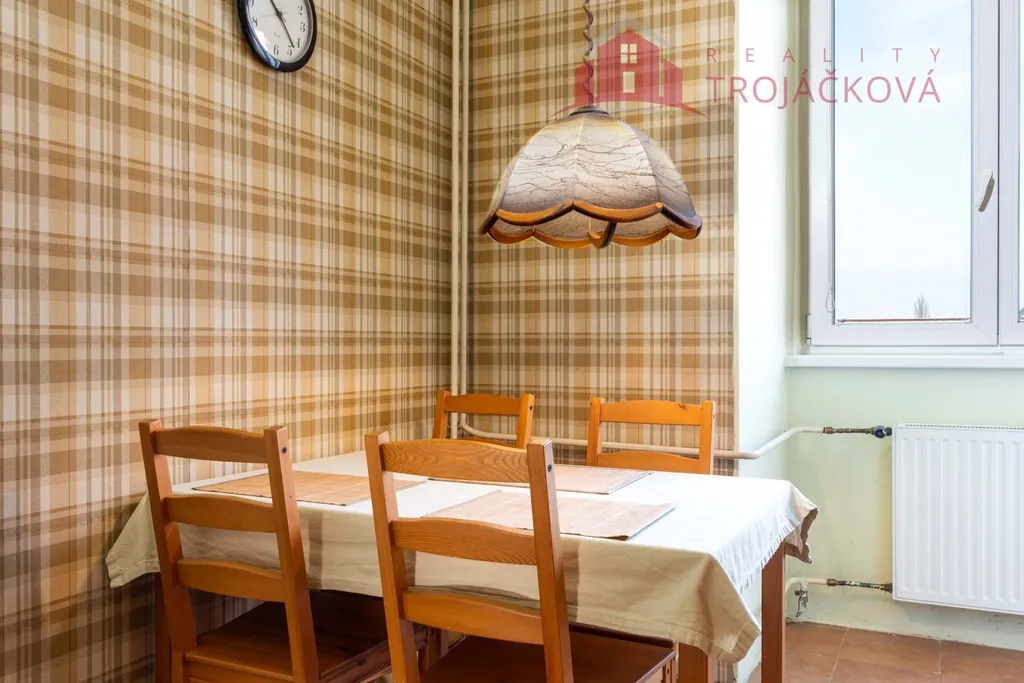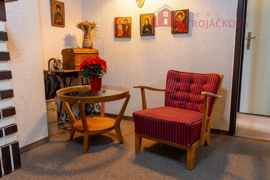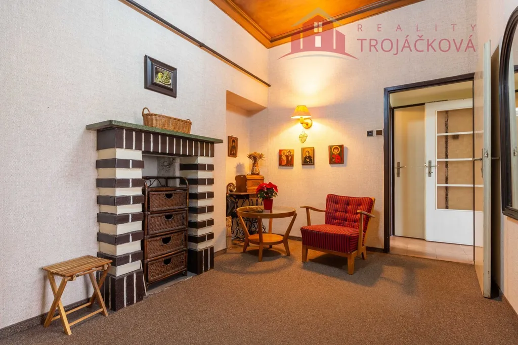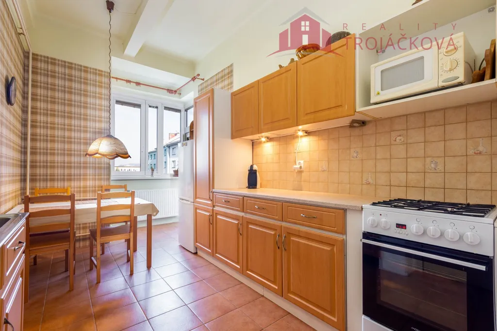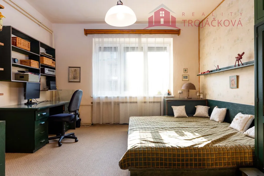 Dispozice bytu je velmi praktická. Po vstupu do bytu vejdeme do prostorné předsíně/haly/ s originálním kazetovým stropem. Z předsíně je samostatný vstup do obývacího pokoje a dětského pokoje s balkonem. Ložnice je dostupná, jak z obývacího pokoje, tak z předsíně. Na předsíň navazuje malá předsíňka, ze které je vstup do koupelny s vanou, do samostatného WC a do kuchyně. Z dětského pokoje a kuchyně se vchází na balkon, který je průchozí a je orientovaný do vnitrobloku. Součástí kuchyně je starší kuch.linka, plyn.sporák a lednice. Z kuchyně je také vstup do komory a spíže. Byt je vytápěný vlastním plynovým kotlem. Stejně je řešen i ohřev vody. Podlahová krytina jsou parkety a na nich koberce. V kuchyni a v koupelně dlažba. V bytě byla provedena výměna oken za plastová a okna do ulice mají elektrické rolety. Před 10 lety proběhla rekonstrukce koupelny včetně rozvodů vody. V domě je rozvod TV a internetu. K bytu náleží velký sklep a komora na patře.