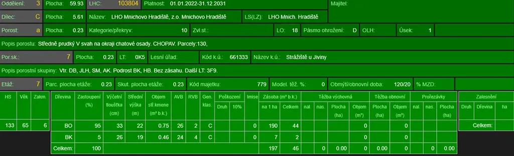 - p.č. 130 vedená jako lesní pozemek o celkové výměře 2 266 m2 (stáří lesa 68 let - zastoupení dřevin borovice, buk)