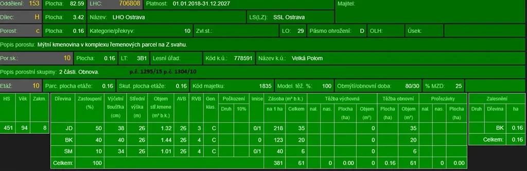 - p.č. 1295/15 vedená jako lesní pozemek o celkové výměře 1 273 m2 (stáří lesa 101 let - zastoupení dřevin jedle, buk, smrk)