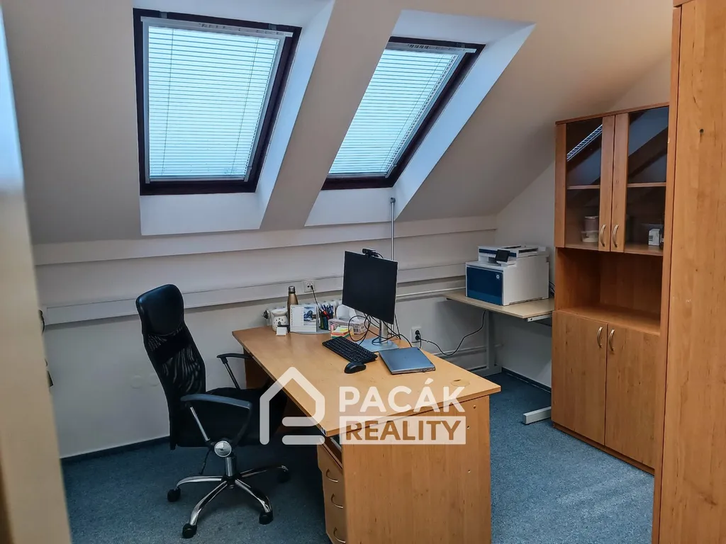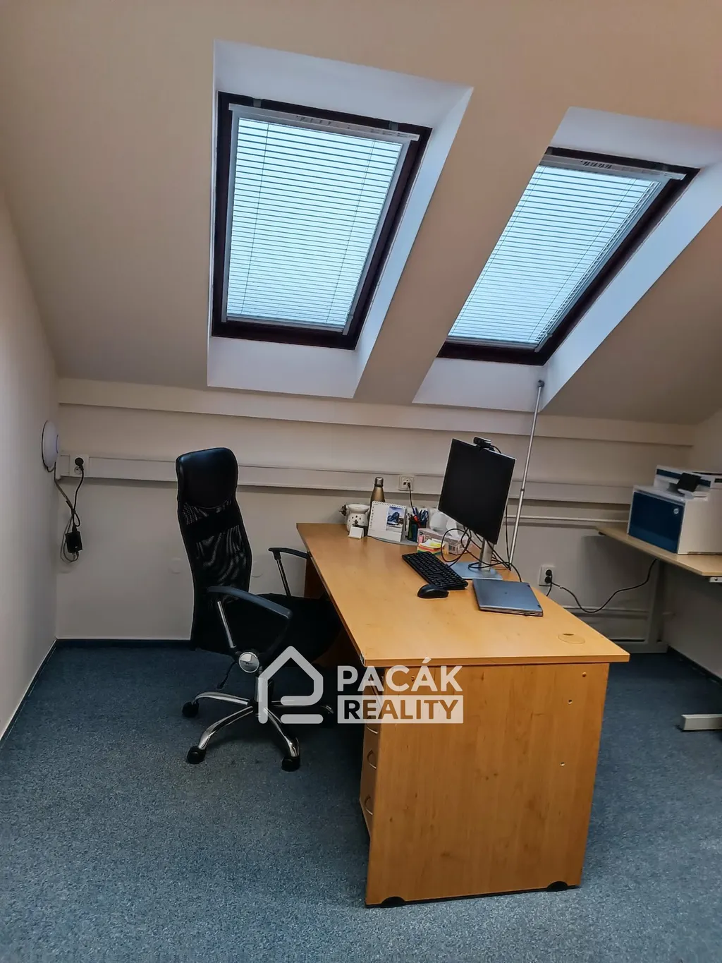 Kancelář je umístěna ve čtvrtém patře budovy a má výměru 12 m2. V rámci budovy připojení k internetu, kuchyňka a WC. Velkou výhodou je možnost parkování na vyhrazeném parkovišti za branou na dálkové ovládání. Kancelář se pronajímá vybavená nábytkem.