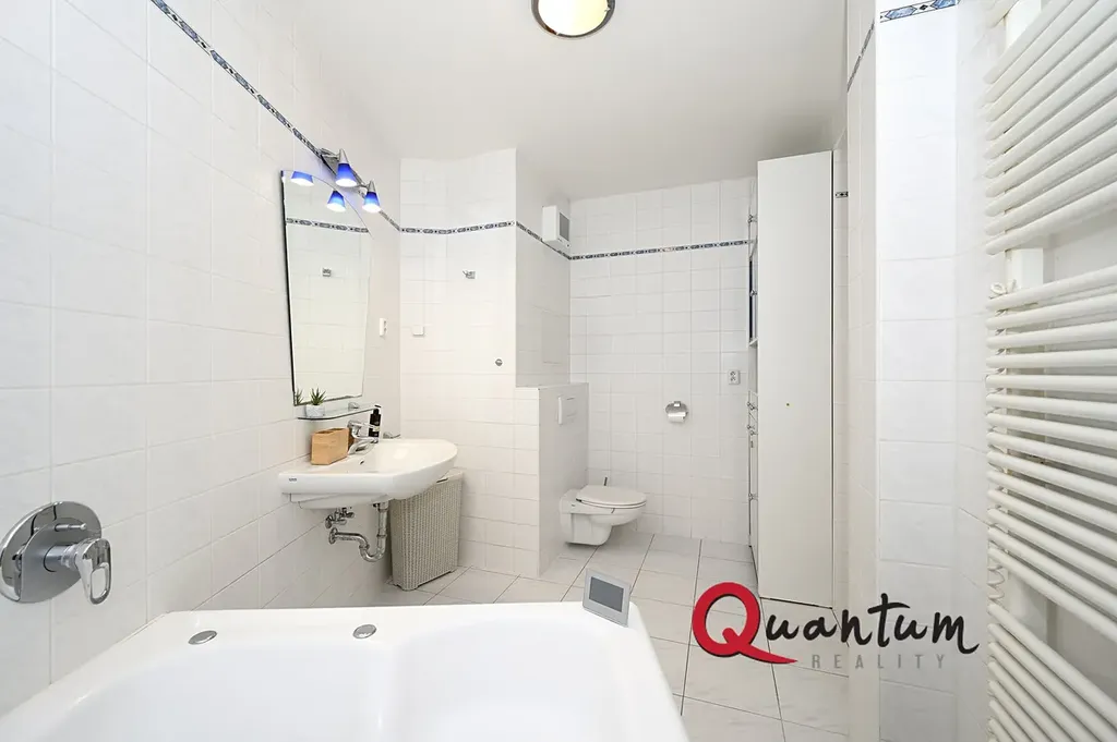 Koupelna disponuje velkou vanou s masážními tryskami, toaletou, umyvadlem a úložnými skříňkami.