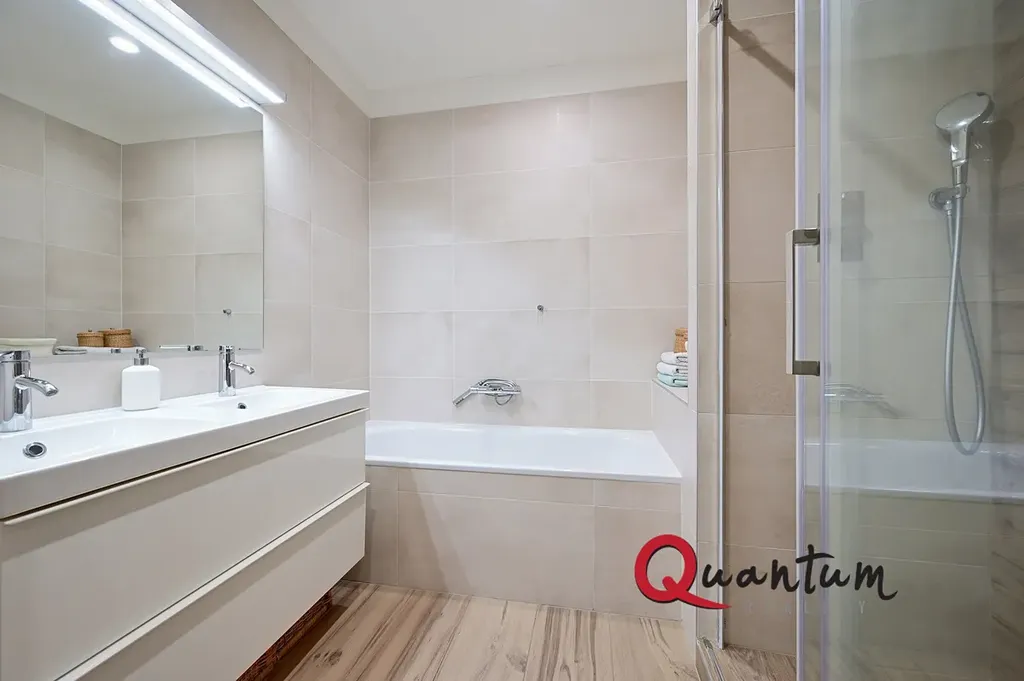 Byt disponuje prostorným obývacím pokojem spojeným s jídelním prostorem a velkorysou kompletně vybavenou kuchyní (90 cm indukční varná deska, americká lednice, myčka, mikrovlnka), což vytváří skvělý prostor pro setkávání s rodinou a přáteli. Obě ložnice orientované do vnitrobloku a zeleně Vám poskytnou komfortní soukromí a relaxaci. Koupelna je vybavena sprchovým koutem, vanou a toaletou.