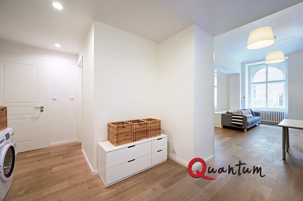 Při vstupu do bytu Vás nadchne krásná kombinace dřevěných podlah z běleného dubu a vysokých klenutých stropů a bílých dveří, což dodává bytu charakter. Jednoduchost bílé barvy a čistoty interiéru tvoří příjemnou spojovací linku tohoto bytu. Velká okna zajišťují dostatek přirozeného osvětlení.