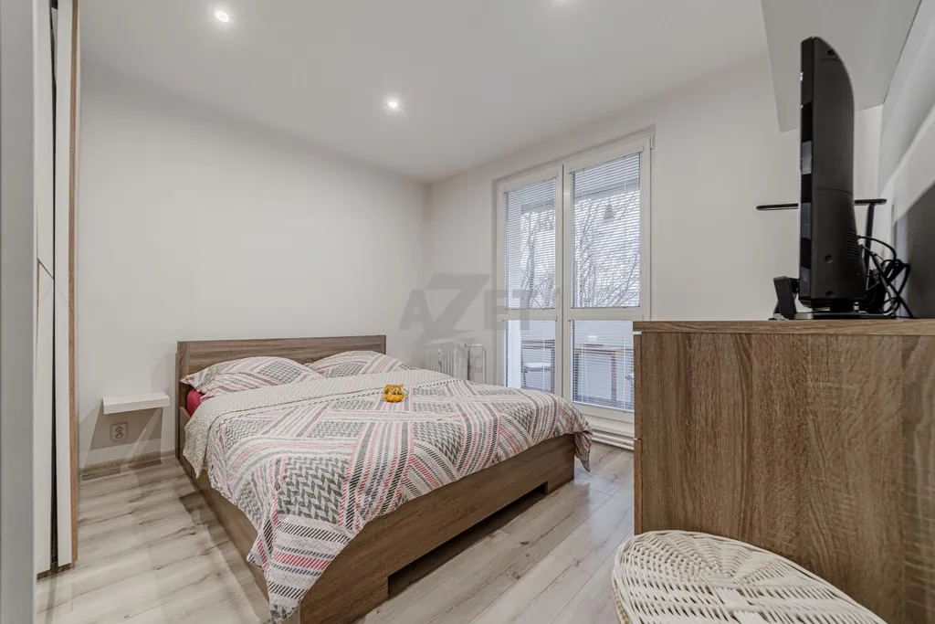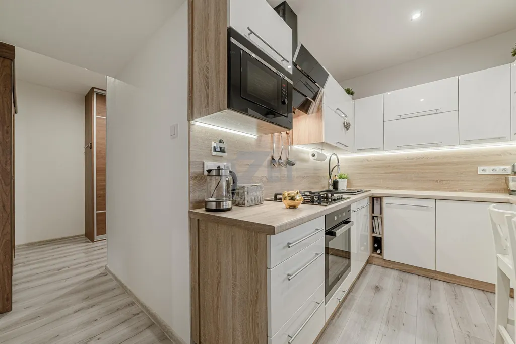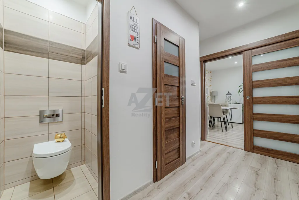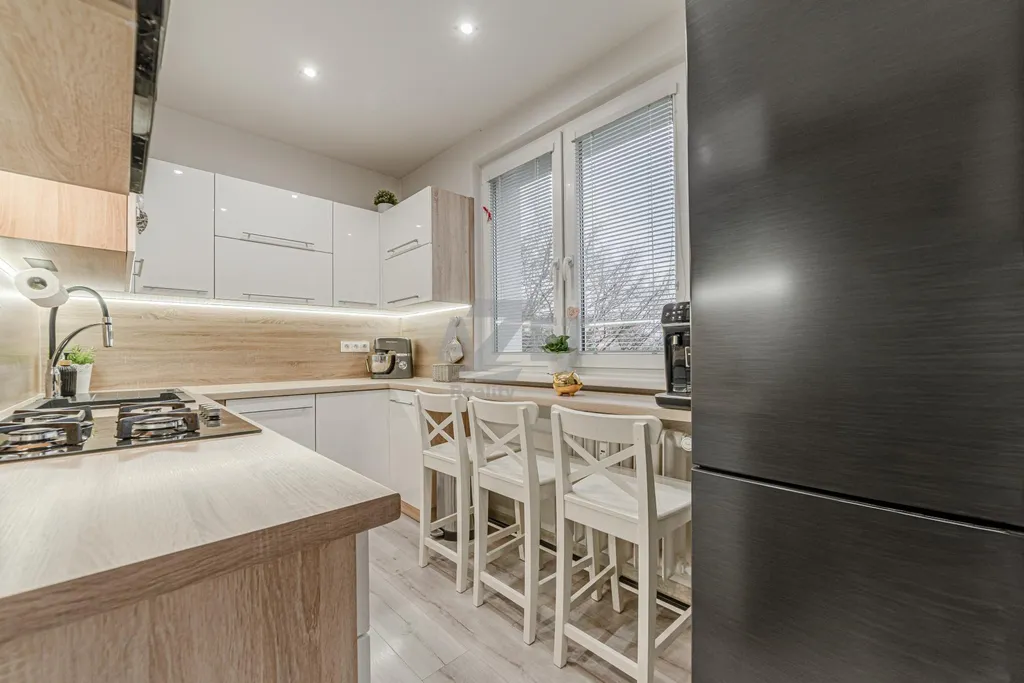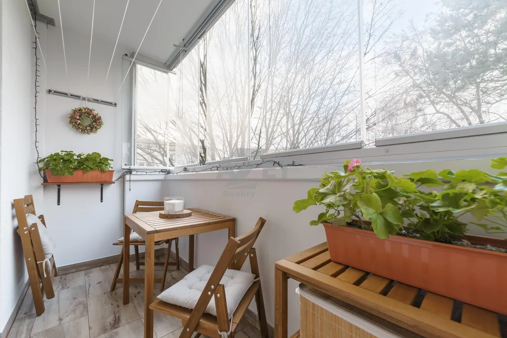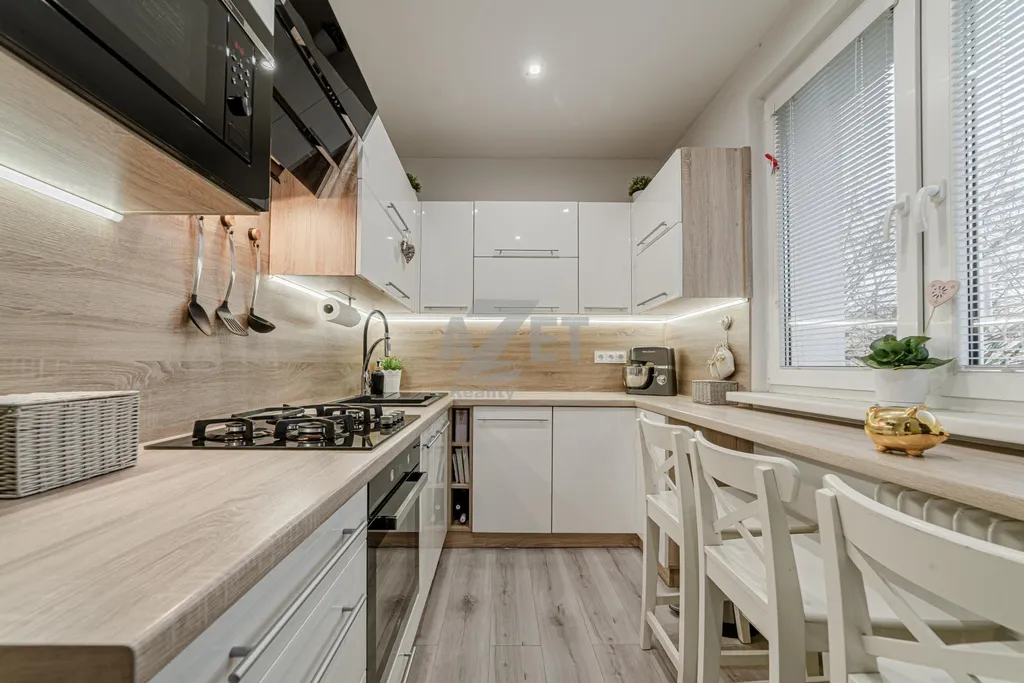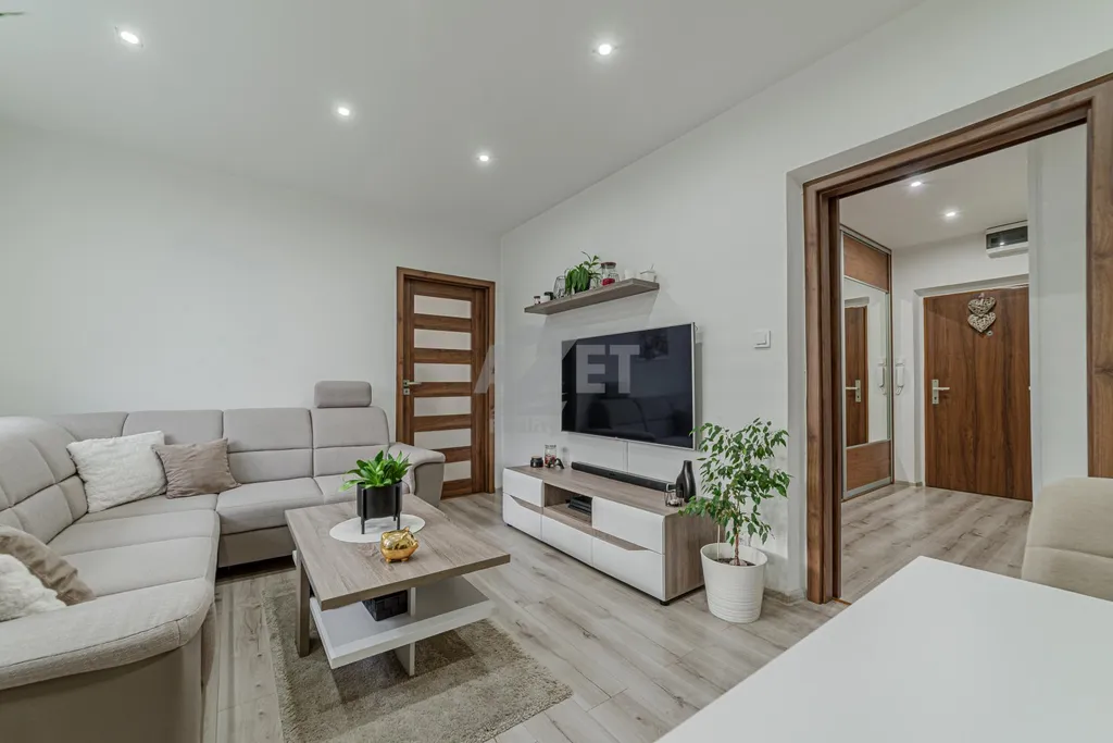 Umístění bytu je v 3. patře bytového domu (4. nadzemní podlaží). Byt nabízí neprůchozí místnosti kromě obývacího pokoje. Vstup do bytu je zajištěn bezpečnostními dveřmi. V chodbě bude ponechána vestavěná skříň v níž nalezneme jedny z prvních z vychytávek - zásuvku pro nabíjení ručního vysavače a posuvné dveře do obývacího pokoje a dětského pokoje zajišťující tak úsporu místa. WC je samostatné a koupelna díky promyšlenému uspořádání umožňuje umísit nejen pračku, ale také sušičku (skříňka nad pračkou se jen přesune). Kuchyně jenž byla provedena na míru majitelům poskytuje maximální praktičnost. Varná deska nyní plynová lze zaměnit za indukční , vše je na tuto změnu připraveno. Budou ponechány samozřejmě spotřebiče včetně lednice. Dětský menší přesto dostačující a bude při předání vyklizen. Obývací pokoj je svým umístěním středobodem celého bytu a najdeme v něm i jídelní část pro celou rodinu. Bude ponechán včetně vybavení vyjma TV. Ložnice, prostorná pro standardní manželkou postel a šatní skříň. Vybavení ložnice může být ponecháno po domluvě s majiteli. Z ložnice je vstup na prostorný, zasklený balkón. Na balkóně opět najdeme vychytávky v podobě stínících rolet, uzamykatelného zasklení a zásuvky pro vánoční světýlka či elektrický gril. Ložnici lze samozřejmě prohodit s nynějším dětským pokojem a dopřát dětem více prostoru.