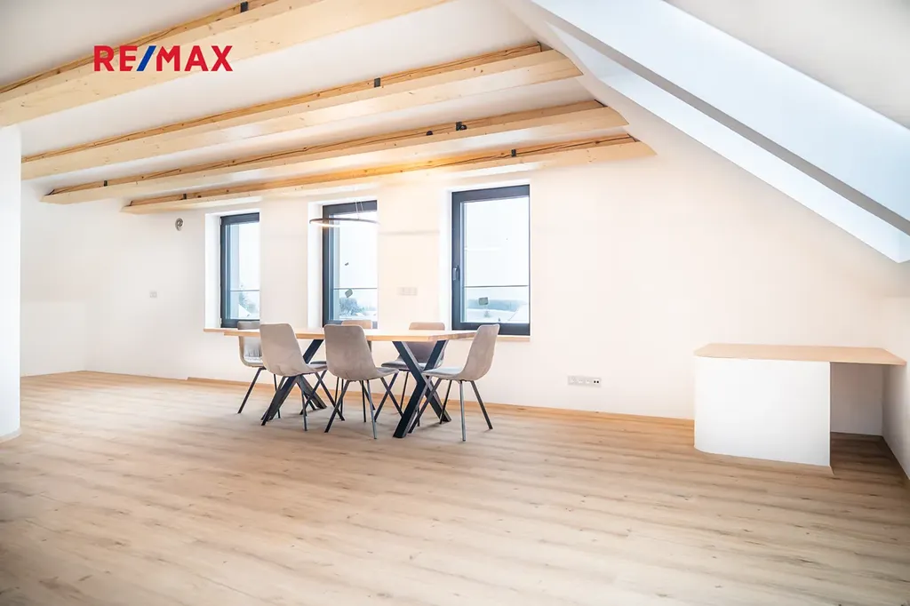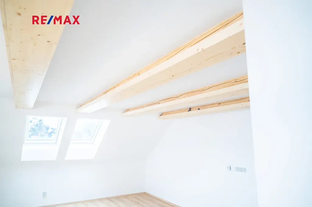 Byt sám o sobě vyniká promyšlenou a velmi atypickou dispozicí. Dominantou hlavního podlaží je moderní kuchyňská linka s dechberoucím výhledem až k vrcholkům Krkonoš včetně Sněžky. Na ni navazuje stylový obývací pokoj, který v sobě krásně spojuje současný design a přiznané prvky dřeva — prostor působí vzdušně, ale zároveň příjemně útulně. V této části naleznete také samostatné WC, komoru a prostornou koupelnu s vanou i sprchovým koutem. Kromě toho jsou zde dva oddělené pokoje — skvělá volba pro dětské pokoje, pracovnu či hostinský pokoj.