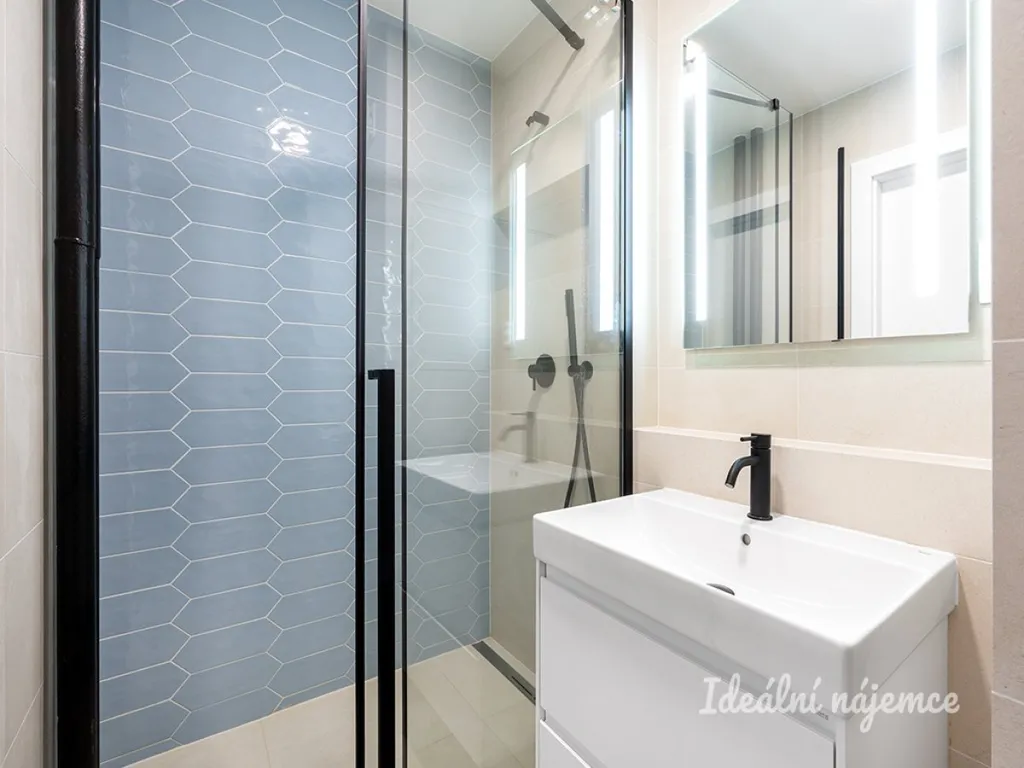 Společná koupelna s toaletou je vybavena sprchovým koutem, koupelnovou skříňkou s umyvadlem.