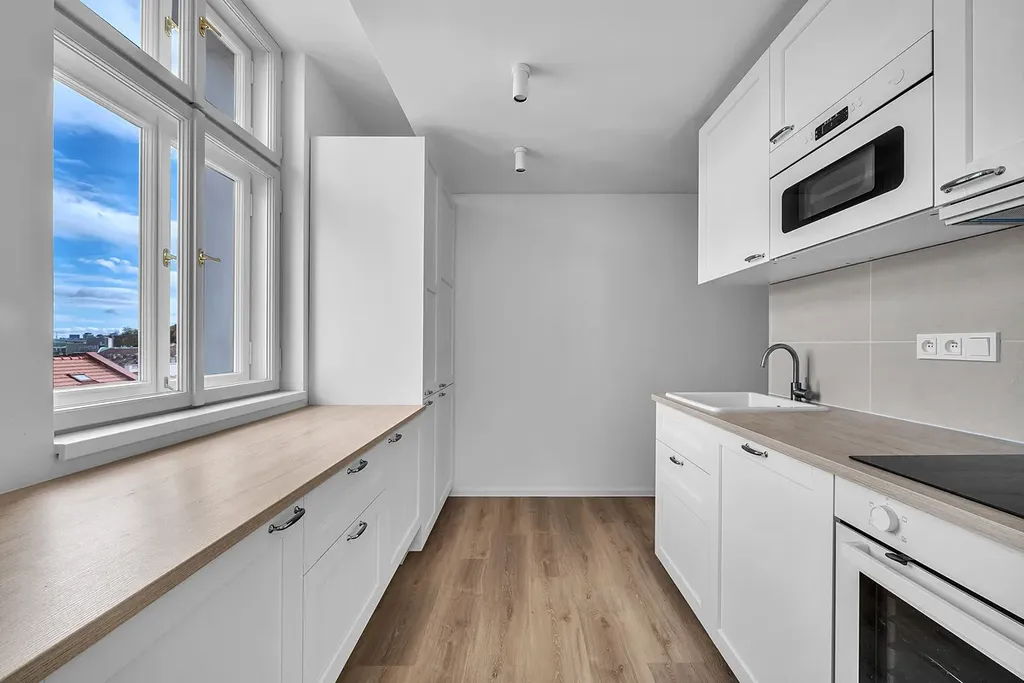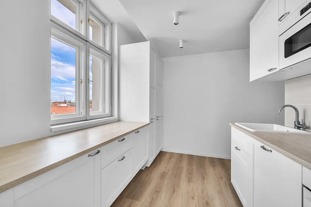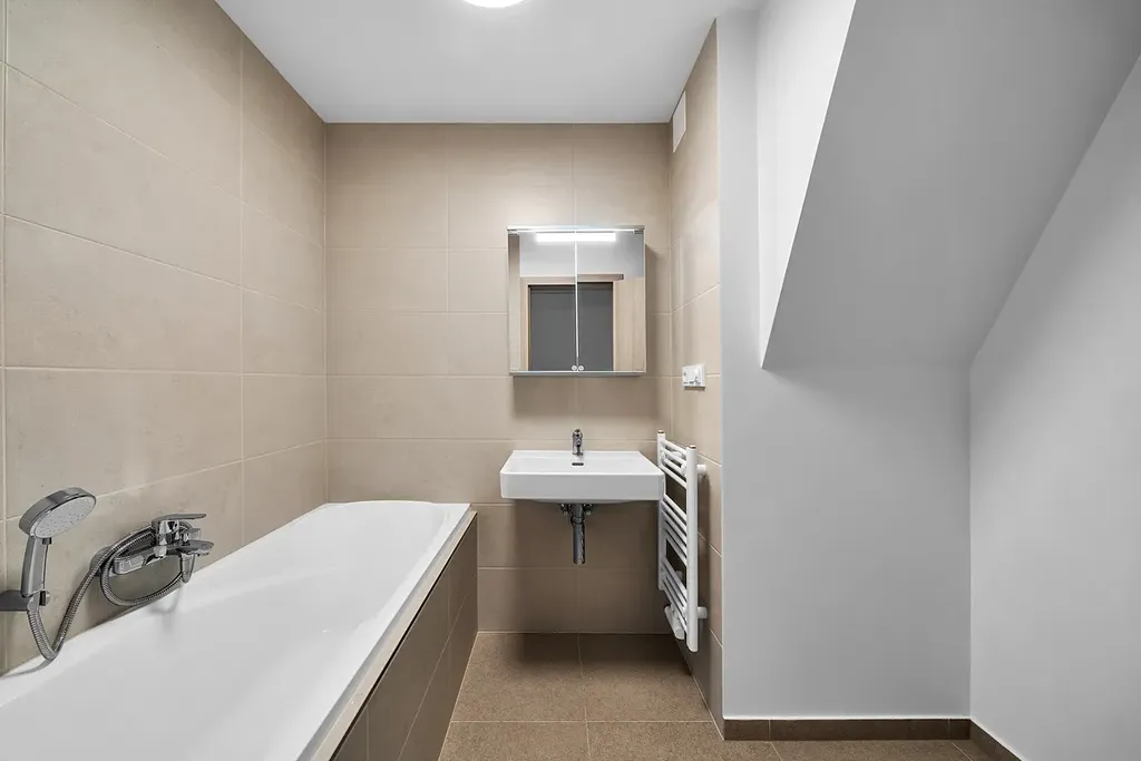 Byt je součástí representativního cihlového domu s výtahem, kdy v r. 2024 vznikl na půdě této budovy zcela nový podkrovní byt. Byt je vybaven klimatizací a tak i ve dnech horka Vám vedro nebude, pokud nebudete chtít. Topení a teplá voda jsou řešeny plynovým kotlem s klasickými radiátory.