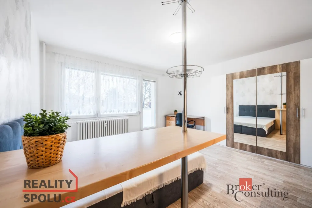 Dispozici tvoří vstupní chodba, hlavní obytná místnost s kuchyňským koutem a ložnicovou zónou, dále koupelna se sprchovým koutem a WC a balkón. Byt je částečně zařízený, což umožňuje jeho dotvoření podle vlastních představ. K bytu rovněž náleží sklep.
