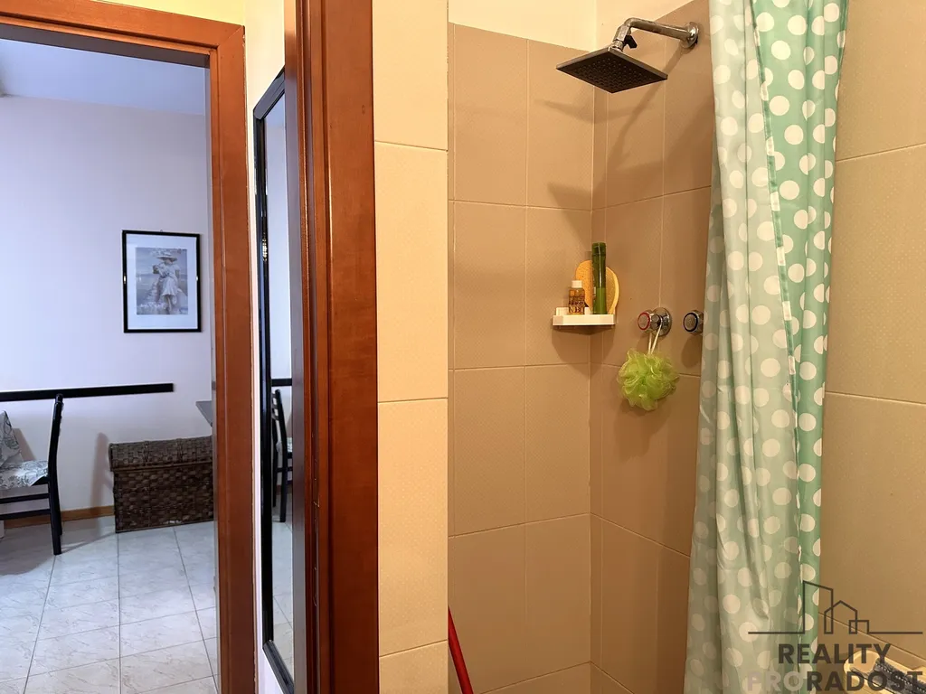 Po vstupu do bytu se ocitnete v prostorném obývacím pokoji s kuchyňským koutem, který tvoří srdce celého prostoru. Dispozici doplňuje chodba, dvoulůžková ložnice a koupelna vybavená sprchovým koutem.