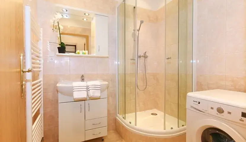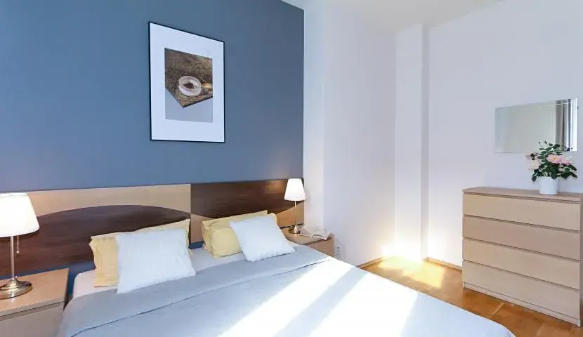 Byt dispozičně nabízí vstupní chodbu, prostorný obývací pokoj se zařízeným kuchyňským koutem (elektrická varná deska, trouba, lednice, myčka, mikrovlnka) a jídelní částí, samostatnou ložnici, koupelnu se sprchovým koutem, umyvadlem, pračkou a oddělenou toaletou. K dispozici je také televize, DVD přehrávač a WiFi. Na podlahách jsou parkety a dlažba.