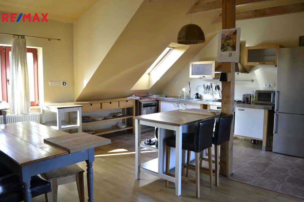 Částečně zařízený slunný podkrovní byt je po nedávné rekonstrukci. Dispozici bytu tvoří velký pokoj s kuchyňským koutem, se vstupem na terasu, ložnice a společná koupelna s toaletou. Díky několika vestavěným skříním byt nabízí dostatek úložného prostoru.