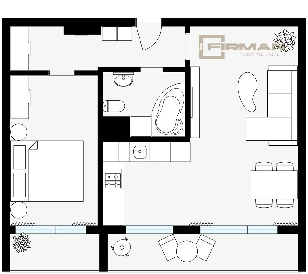 Dispozice nabízí prostorný obývací pokoj s kuchyní, pohodlnou ložnici a prostornou chodbu, která nabízí dostatek prostoru pro umístění vestavěných skříní. Velkou předností jsou dvě samostatné lodžie – jedna přístupná z obývacího pokoje (7 m²), druhá z ložnice (3,5 m²). Z obou lodžií se navíc otevírá neuvěřitelný výhled na Kutnou Horu, který dodává bytu další rozměr. Moderně řešená koupelna spojená s toaletou nabízí prostorný komfort s vanou i místo na pračku.