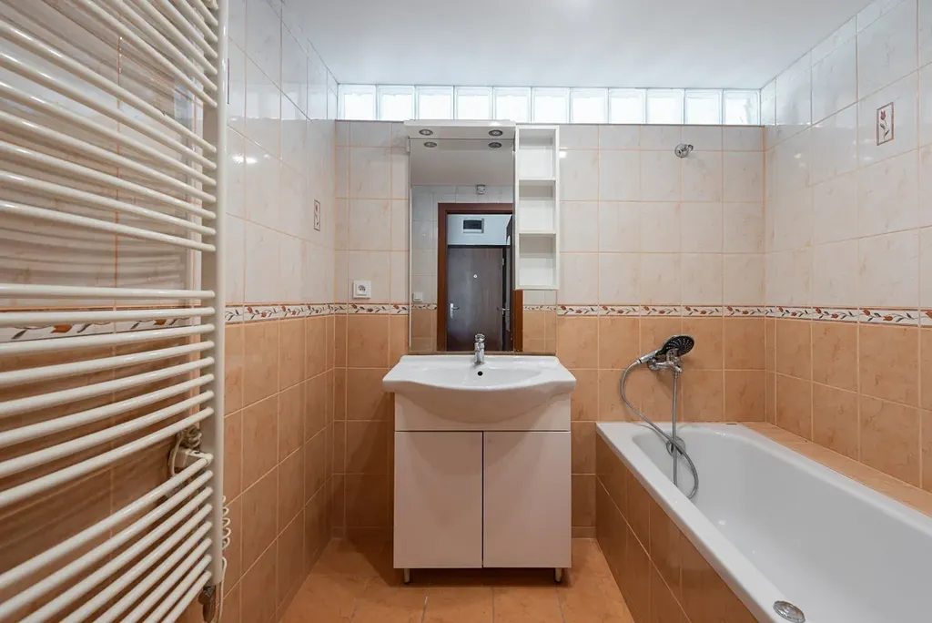 Koupelna je vybavena vanou, přirozeným světlem přes luxfery a celkově příjemnou atmosférou. Toaleta je samostatná. Pračka, která je součástí pronájmu, je chytře umístěna ve výklenku na chodbě. Úložné prostory řeší velké vestavěné skříně. Život vám zpříjemní bezpečnostní dveře Sherlock, optický internet a velká okna se žaluziemi.
