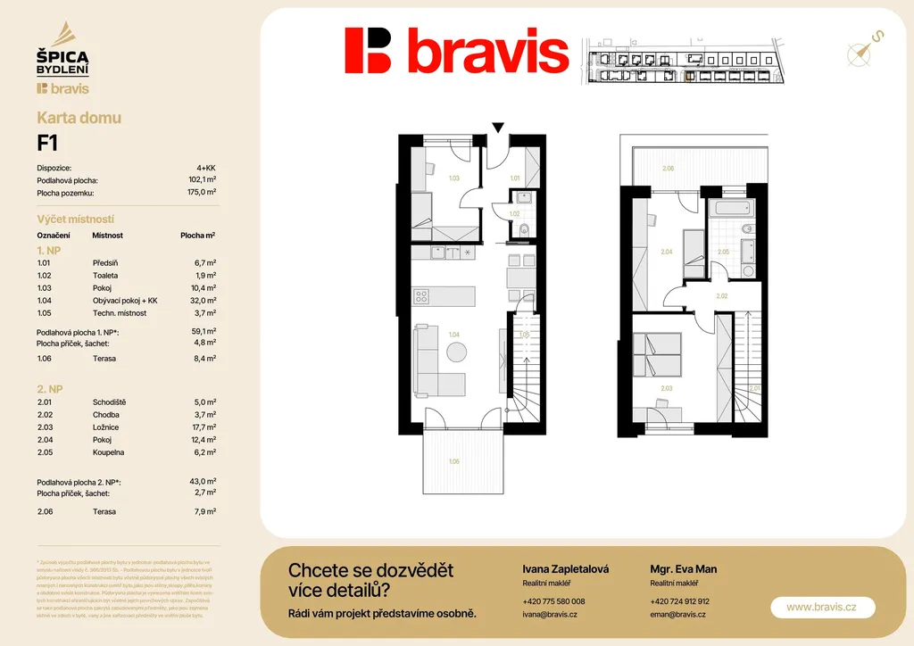 Nabízíme exkluzivní rodinný dům označený F1-1 o dispozici 4+kk, zahrada 56,3 m2 ,terasa 17,4 m2, zpevněná plocha 37,2 m2 v novém projektu Špica bydlení. Dům o celkové výměře 102,1 m2 na pozemku 175 m2, plochu pozemku bez domu 101,1 m2.