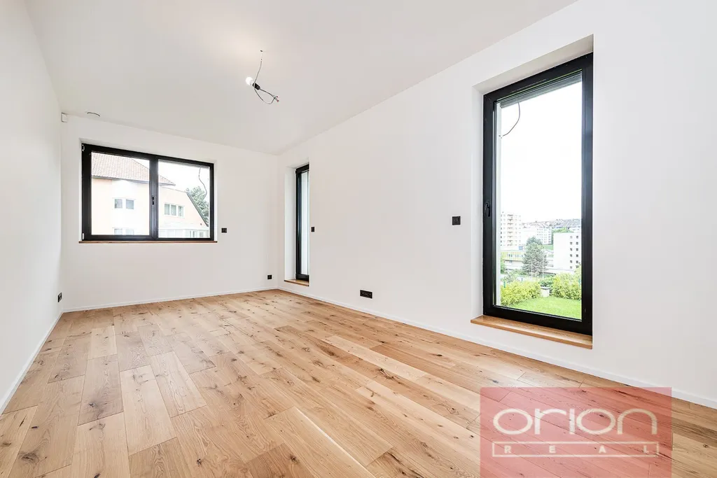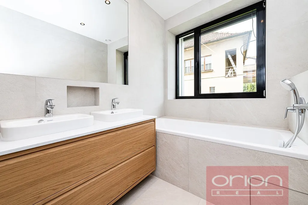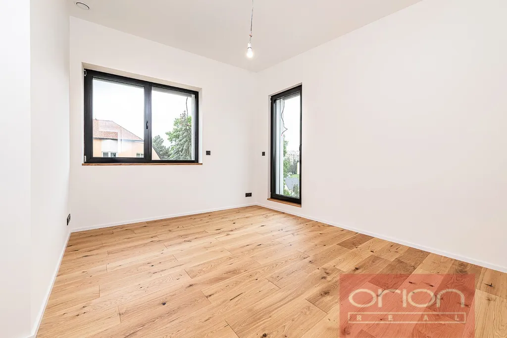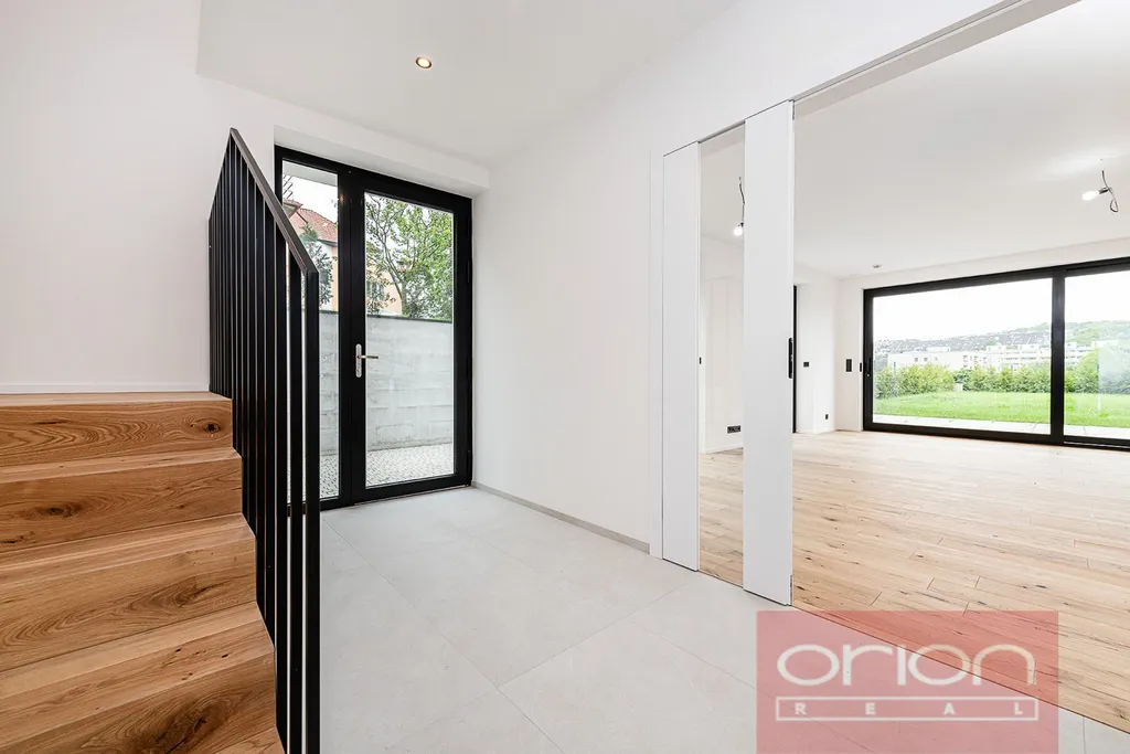 Nabízíme k pronájmu novostavbu - luxusní rodinný dům 7+kk v klidné vilové čtvrti v Praze 5 – Stodůlky s výborným dopravním spojením do centra, do mezinárodních škol, na letiště. Tento moderní rodinný dům na třech podlažích spojuje nadstandardní design a nejnovější technologie. Dům se nachází v klidné rezidenční lokalitě Prahy 5, na rozhraní Motola a Stodůlek. V přízemí domu se nachází vstupní hala, prostorný obývací pokoj se vstupem na zahradu (292 m²) a terasu, otevřený prostor s jídelnou a kuchyní. V prvním patře je hlavní ložnice s vlastní koupelnou a šatnou, samostatná koupelna a dvě ložnice. V posledním patře je ložnice s koupelnou a terasou (17,1 m²), další dvě ložnice a technická místnost s prádelnou. Osvětlené schodiště propojuje celý dům. Dům je dokončený s dřevěnými podlahami, koupelnami a dalším vybavením: rekuperace, tepelné čerpadlo, klimatizace, elektrické venkovní žaluzie, hliníková okna s trojsky, centrální vysavač, alarm, bezpečnostní kamerový systém a videotelefon. Garáž je prostorná pro dva vozy s nabíjením pro elektromobily a další dvě parkovací místa jsou na pozemku. Užitná plocha domu 282 m², plocha pozemku 426 m², plocha zahrady 292 m². Kolaudace v roce 2025, energetický štítek třídy B velmi úsporná.