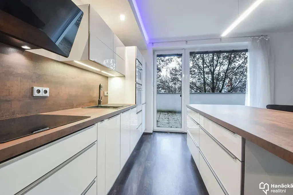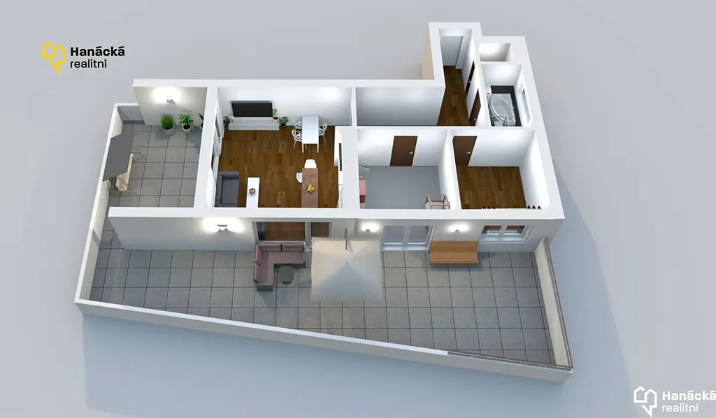 Naprostou raritou této nabídky je však prostorná terasa o úctyhodné výměře 80 m². Takový venkovní prostor je v městské zástavbě skutečným luxusem. Na terasu se pohodlně dostanete z kuchyně, obývacího pokoje i jedné z ložnic, takže se stává přirozeným prodloužením bytu – ideálním místem pro ranní kávu, rodinné večeře pod širým nebem či klidný odpočinek po náročném dni.