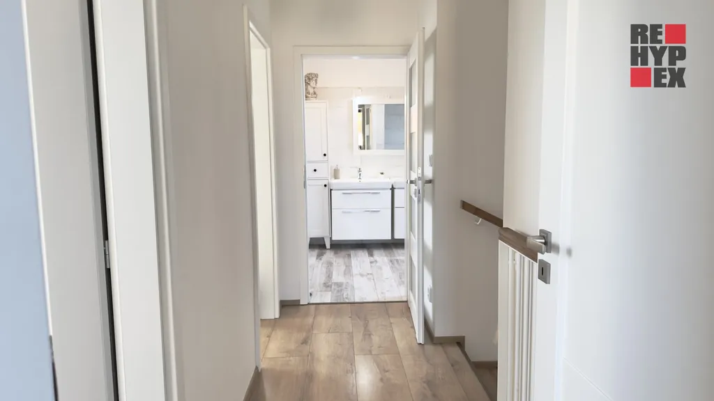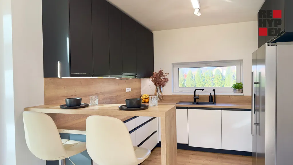 Dispozice jsou 4+KK, ale díky zimní zahradě máte pokoj a prostor navíc. V domě jsou dále dvě koupelny, dvě ložnice, kotelna, spíž a prostorný obývací pokoj spojený s kuchyní.