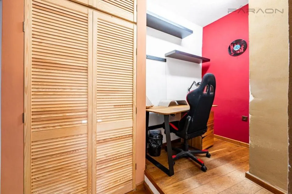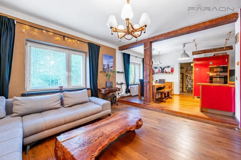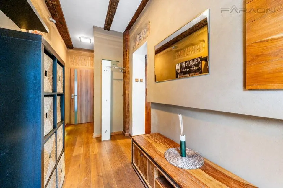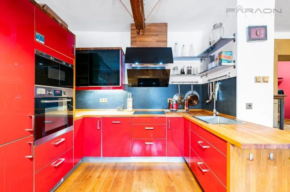 Kompletní vybavení zahrnuje moderní kuchyň v červeném designu vybavenou spotřebiči, dřevěné podlahy, masivní dřevěný nábytek, nedávno pořízená rozkládací pohovka, koupelna - marocký štuk (ručně broušené), vestavěné skříně, žaluzie ve všech oknech bytu, pračka Gorenje, sušička LG, funkční krb. V ceně nájmu je zahrnuto parkovací stání a možnost využití majitelova sklepu.