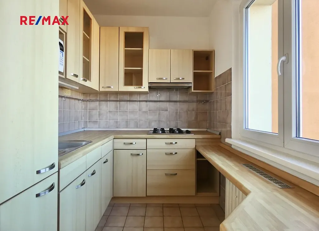 Prostorný obývací pokoj se vstupem na balkón a ložnice mají na podlahách krásné dřevěné parkety, samostatná zařízená kuchyň má stejně jako koupelna a toaleta na podlaze dlažbu. V předsíni, kde je umístěna prostorná vestavěná skříň, najdeme laminátovou plovoucí podlahu. Kuchyň je vybavena plynovou varnou deskou, digestoří, lednicí s mrazákem, mikrovlnnou troubou a dostatkem pracovního i úložného prostoru. Koupelna s vanou je vybavena pračkou, toaleta je samostatná.