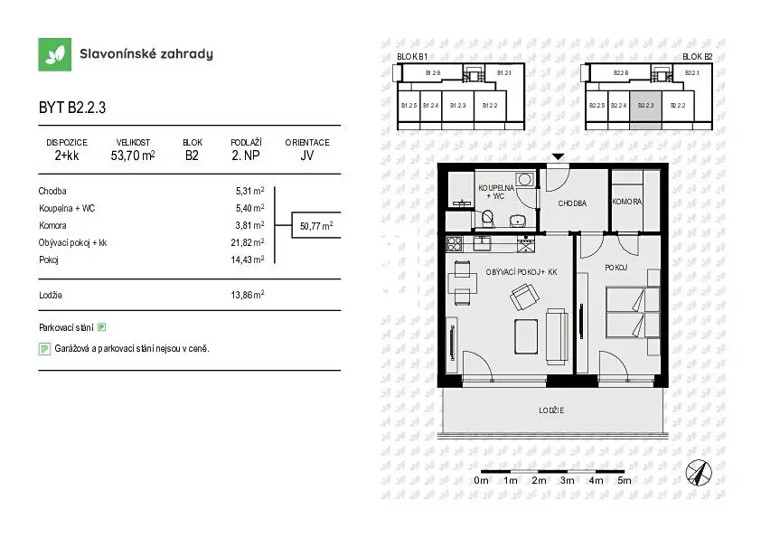 Byt B2.2.3 o dispozici 2+kk má podlahovou plochu 53,68 m² a terasa o velikosti 13,6 m² se nachází ve 2.NP bytového domu s nízkým počtem bytových jednotek.