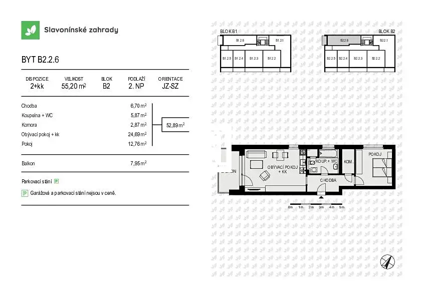 Byt B2.2.6 o dispozici 2+kk má podlahovou plochu 55,2 m² a terasa o velikosti 7,95 m² se nachází ve 2.NP bytového domu s nízkým počtem bytových jednotek.