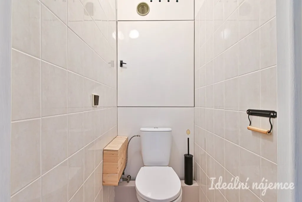 Dispozice bytu je velmi praktická. V zádveří se nachází šatní skříň s věšákem. Koupelna je vybavena vanou a úložnou skříňkou, toaleta je umístěna samostatně.