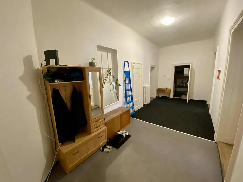 Vstup do bytu je do velké obytné haly (předsíně), odkud jsou vstupy do všech místností bytu, vyjma jednoho pokoje 9 m2, který má přístup přes obytnou kuchyni. Vše ostatní tedy přístupné z předsíně - dva velké pokoje 32+26 m2 do Jiráskovy ulice, menší pokoj je s balkonem s výhledem na hrad Špilberk, kuchyně s jídelním koutem a oknem 14 m2 se spíží 2 m2, koupelna s vanou sprchou 7 m2, samostatné WC. K dispozici je sklep.