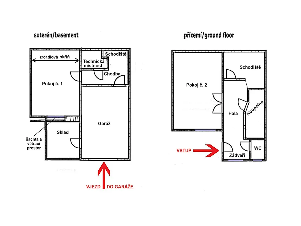 -1PP (48,25 m2): pokoj č. 1 (18 m2), garáž s vraty na dálkové ovládání (15,9 m2), sklad (5,35 m2), technická místnost s kotlem a přípojkou pro pračku (2,90 m2);