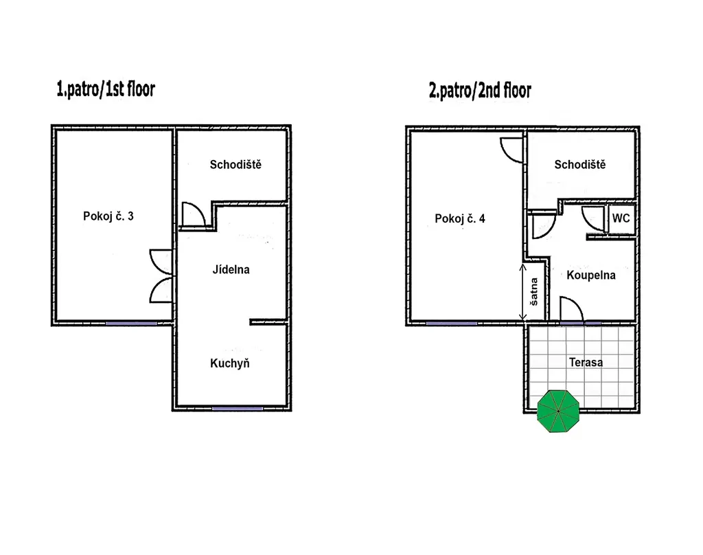 - 2NP (41,96 m2): pokoj č. 3 (20,10 m2), kuchyň (9 m2) + jídelna (6,3 m2), podesta (2,3 m2) a schodiště (4,10 m2);