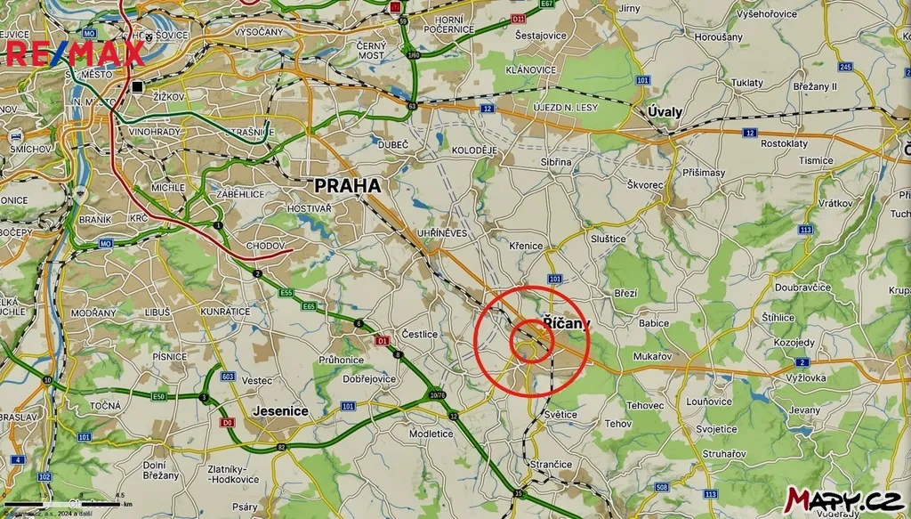 Super spojení s Prahou - dálnice D1 4 km, do centra Prahy se pak dostanete za 15 min. K bytu je vyhrazené 2x vlastní parkovací místo v osobním vlastnictví. Vlakem cesta do centra Prahy trvá jen 30 min, intervaly vlaků 10 - 30 min.