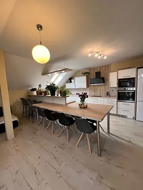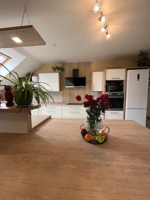 Pronájem krásného bytu 4 + KK o velikosti 120 m2, který se skládá z velkého obývacího pokoje s kuchyní, 3 ložnic a sklepa o velikosti 13 m2, v Chodově u Karlových Varů, v nově postavených vilových domech, ve třetím poschodí jednoho z nich.
