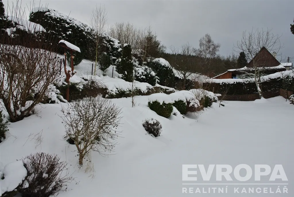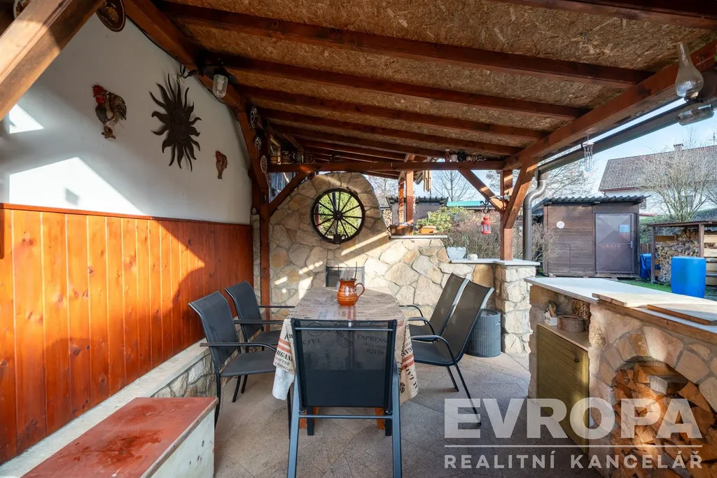Zahrada o rozloze 850 m² nabízí mnoho krásných zákoutí, terasy, kamenné zídky a dostatek soukromí. K domu patří krytá terasa s kamenným grilem – perfektní pro letní večery s rodinou či přáteli. Na pozemku nechybí ani prostorná kůlna na nářadí a zahradní techniku.