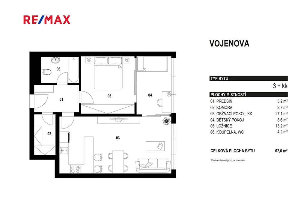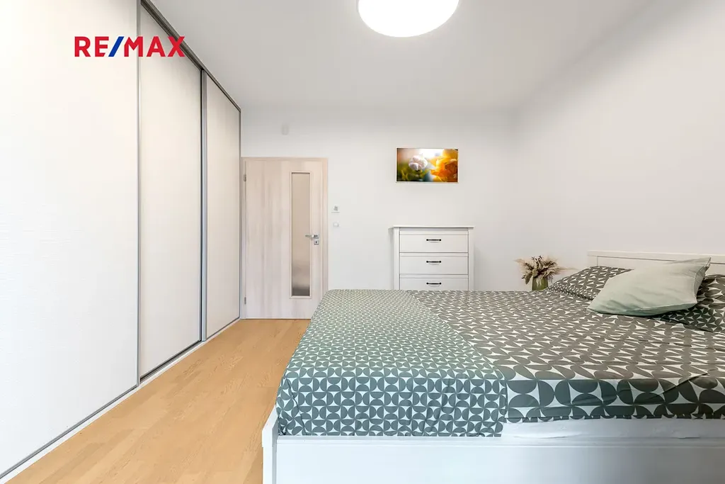 Jihovýchodně orientovaný byt o celkové ploše 62 m² se nachází ve 4. nadzemním podlaží moderní novostavby. Dispozice zahrnuje obývací pokoj (27,1 m²), ložnici (13,2 m²) a další pokoj (8,6 m²), který lze využít jako dětský pokoj nebo pracovnu. Dále se v bytě nachází samostatné WC, komora a vstupní chodba (ke bytu náleží také sklep v 1PP.